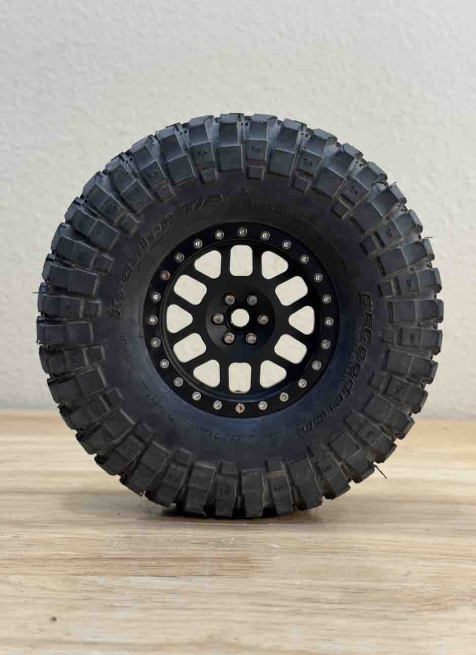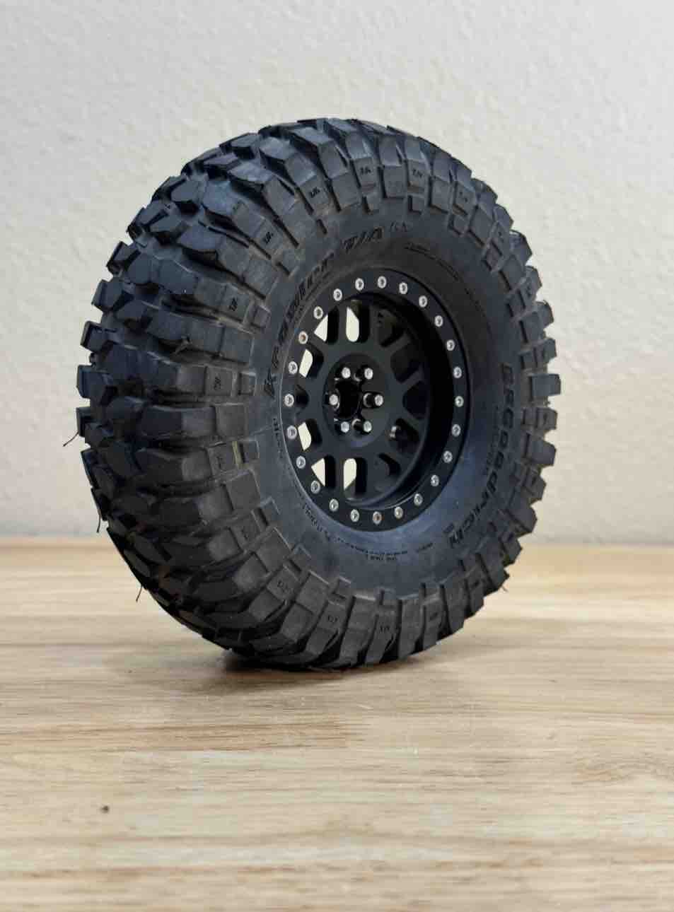 These are sold as a set of 4 with Free Shipping in the US. Tires do Not include foams. SL3D Squid’nserts 3D printed tire inserts are my recommendation for tire inserts. What is a Cut’N’Shut tire? These hand made tires start as a standard 2.2 bead, 5.5″ height Pro-Line Krawler G8 compound tire, they are then cut up the sidewall, across the tread and down the sidewall. A section from a donor tire is then inserted to add more tread and sidewall where the tires are then glued back together creating a taller 6″ tire with larger 2.6″ bead maintaining the standard width of the original tire. The glued section is very strong as it has been bonded with tire specific glue and tested thoroughly by myself and competitive drivers. These require 2.6″ wheels for mounting. The wheel that is pictured is available on Amazon.